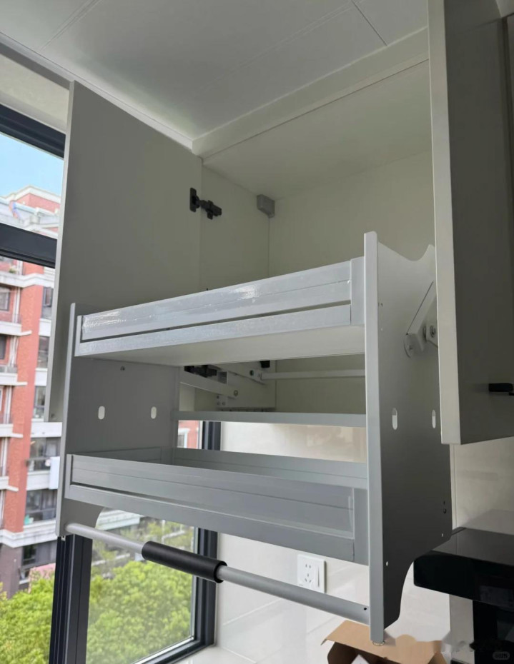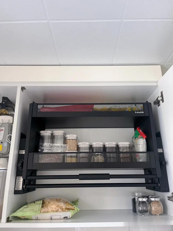 在日常的生涯中,使用吊柜的储物空间十分的未便,便加装了吊柜拉篮,给我方的日后使用减少了缺乏。