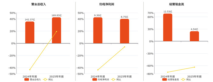 公司买卖总收入为169.83亿元,在已显露的同行公司中排行第11,较旧年同讨教期买卖总收入加多27.46亿元,同相比旧年同时飞腾19.29%。归母净利润为8.75亿元,在已显露的同行公司中排行第14,较旧年同讨教期归母净利润减少5514.73万元,同相比旧年同时着落5.93%。主义动作现款净流入为4.54亿元,在已显露的同行公司中排行第33,较旧年同讨教期主义动作现款净流入减少7.99亿元,同相比旧年同时着落63.80%。