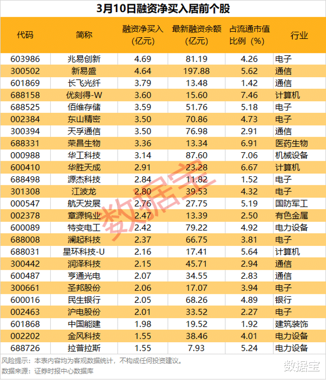 具体到个股,3月10日共有1977股获融资净买入,净买入金额在1亿元以上的有45股,其中9股融资净买入额均超3亿元。