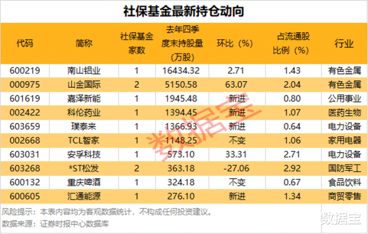 执股数目方面,社保基金执股量最多的是南山铝业,共执有1.64亿股;山金国外、嘉泽新能紧随后来,执股量别离为5150.58万股、1945.48万股。