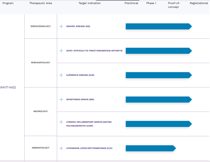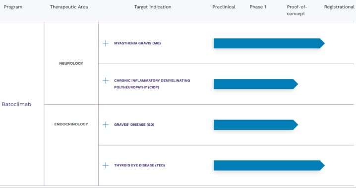 围绕batoclimab,Immunovant开采了重症肌无力(MG)、慢性炎性脱髓鞘性多发性精神病(CIDP)、甲状腺眼病(TED)、Graves病等多种由IgG介导的本人免疫病。