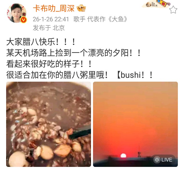 一句“人人腊八快意”,就是歌手周深对网友最佳的祝贺!