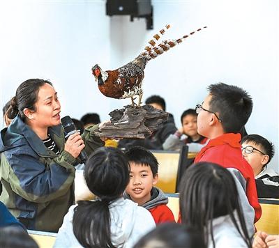 图为4月3日,江西官山国度级当然保护区的责任主说念主员在向学生老师独特野纯真物的习性。