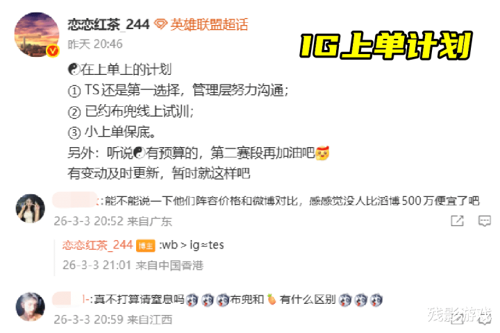 在LPL第一赛段淘汰赛的比拼中,IG最终已经被AL以3-1的比分拿下,缺憾出局,畛域了我方的第一赛段之旅。在这个赛段里,IG的推崇其实并不好,虽说军队留下了Rookie和小Wei,但Rookie的情景却不及以老带新,小Wei一东谈主难挽败局。在他们的比赛里,小上单Soboro这位新东谈主断送率极高,虽说新东谈主需要稳妥,但送的太多属实是有些令东谈主继承不了,这不,不少粉丝都提议IG换东谈主,就算是培养新东谈主,也得找个有盼头的,Soboro显得有点拉垮了。