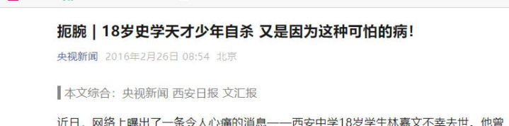 扼腕 | 18岁史学天才少年自尽 又是因为这种可怕的病!央视新闻 2016年2月26日 08:54 北京