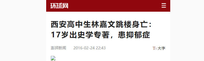 西安高中生林嘉文跳楼身一火:17岁出史学专著,患抑郁症 澎湃新闻 2016-02-24 22:43