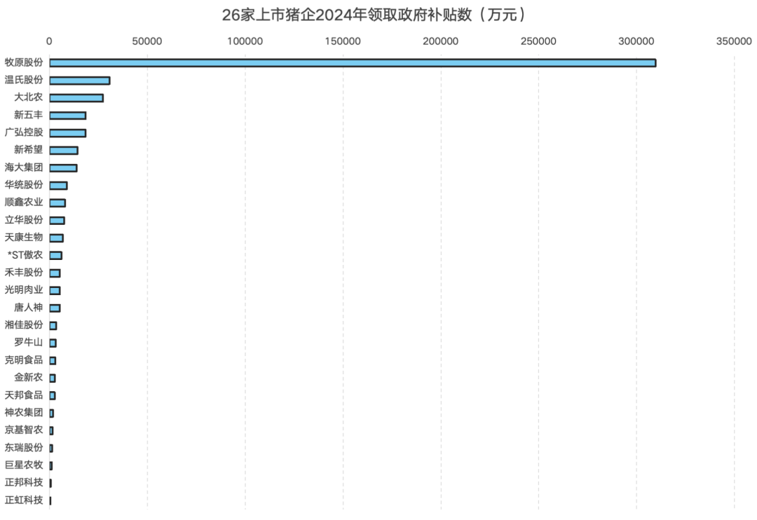 从短期分拨来看,2024年寰球26家上市猪企共计赢得政府补贴50.58亿元,户均补贴限度达1.95亿元,其中牧原股份以30.96亿元的补贴额独占鳌头,占26家上市猪企补贴总和的比重逾越61%,荒谬于尾部数十家上市猪企补贴总和的数十倍;温氏股份、大败农差异以3.06亿元、2.73亿元位居第二、三位,头部三家企业共计占据补贴总量的七成以上,中小衍生户竟然难以赢得同等扶助。