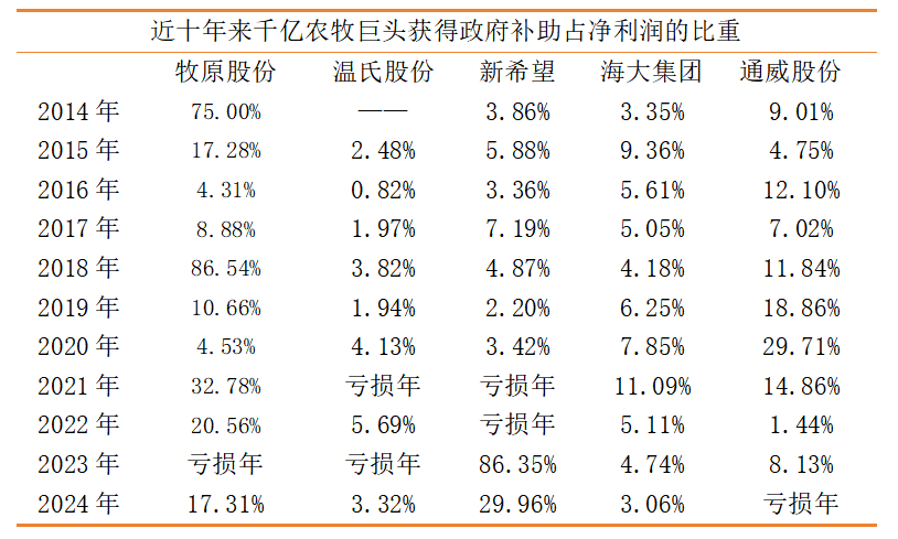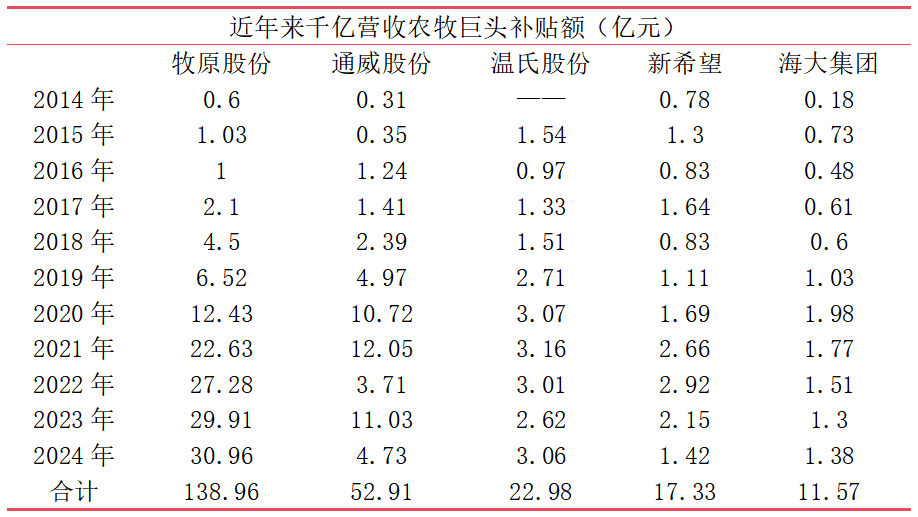 从永恒集结来看,2014至2024年五大千亿营收级农牧巨头累计赢得补贴逾越243亿元,其中牧原股份十年累计获补138.96亿元,通威股份52.91亿元,温氏股份22.98亿元,新但愿17.33亿元,海大集团11.57亿元,行业补贴年复合增长率逾越20%,但政策红利高度聚合于头部企业,与中小衍生户酿成显然割裂。