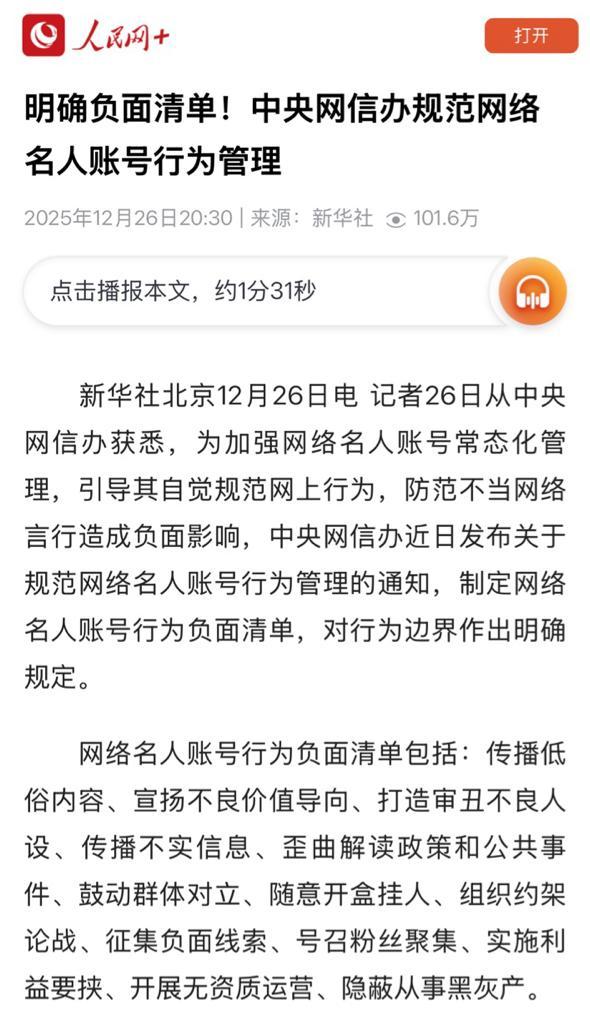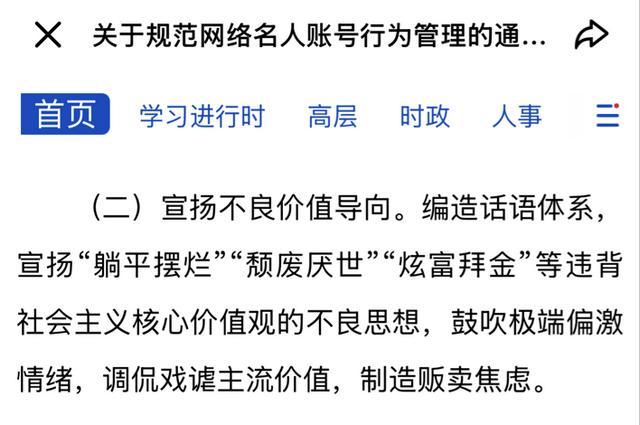 而早在2025 年 12 月中央网信办发布《网罗名东说念主账号行为负面清单》,明确将 “宣扬炫富拜金等屈膝社会目的中枢价值不雅的不良想想” 列为 13 条中枢红线之一。
