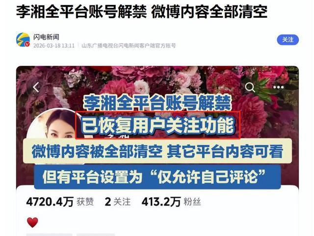 更让东说念主没意料的是3月17日,李湘多平台被解禁,收复关切功能,只不过对账号的归天依然存在。