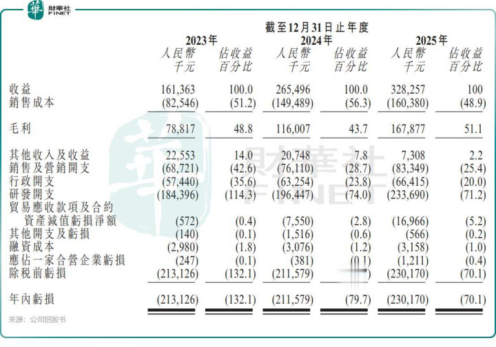 事迹施展方面,2023年至2025年,公司收入由1.61亿元增长至3.28亿元,同期失掉分离为2.13亿元、2.12亿元及2.30亿元。公司以高研发进入入手发展,2025年研发支拨卓绝2.3亿元,占收入比重高达71.2%,这亦然公司抓续失掉的主要原因之一。